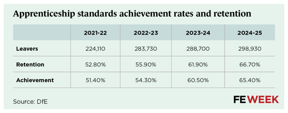 The national apprenticeship achievement rate has risen to 65.4 per cent for the 2024-25 academic year, just missing the government’s long-standing target.