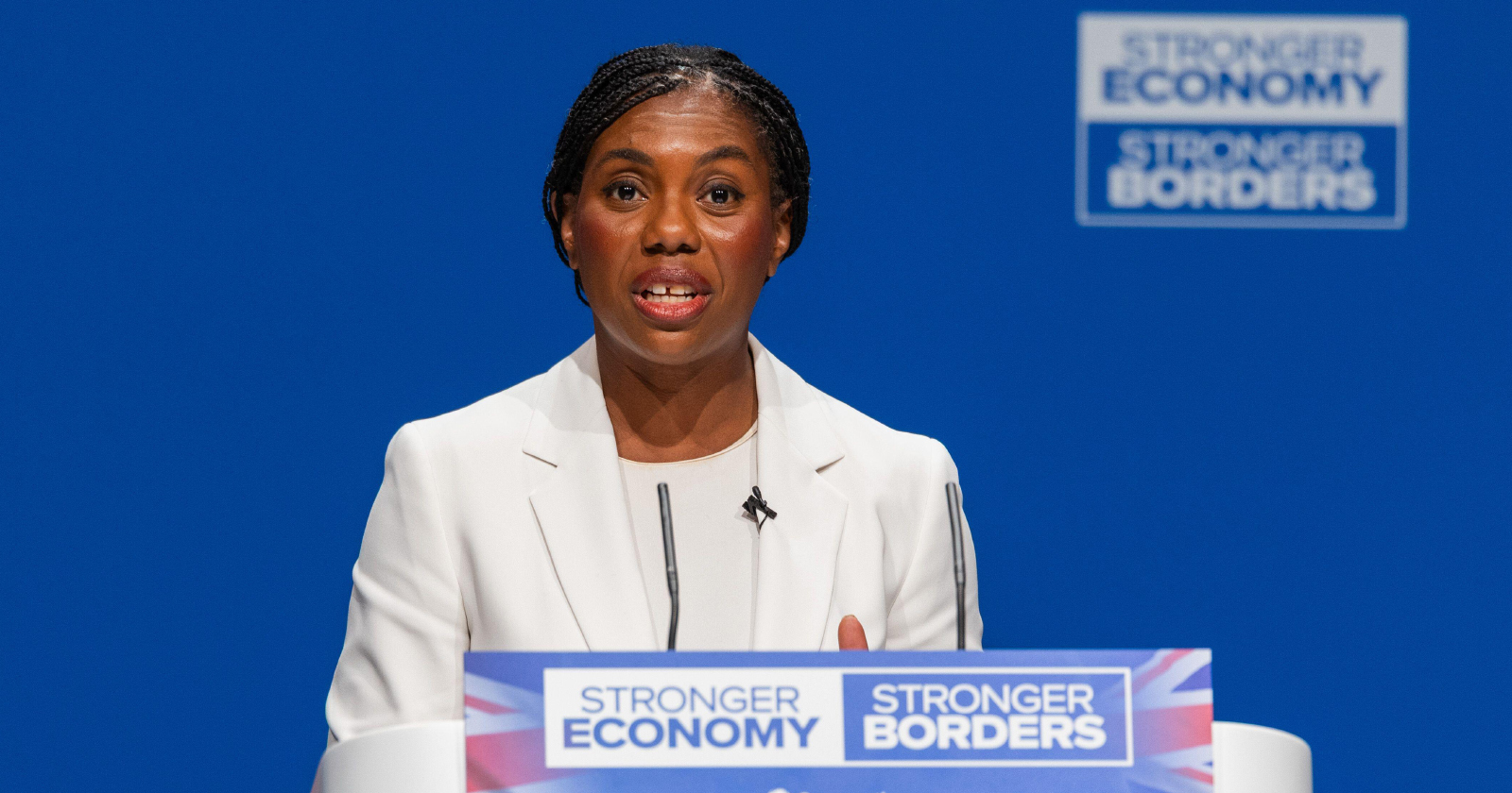 3CTAGF1 Manchester, UK. 05 OCT, 2025. Kemi Badenoch, Leader of the Opposition, Leader of the Conservative Party and Conservative MP for North West Essex, speaks from the main stage on day one of the Conservative party conference at Manchester Central Convention Complex. Credit Milo Chandler/Alamy Live News
