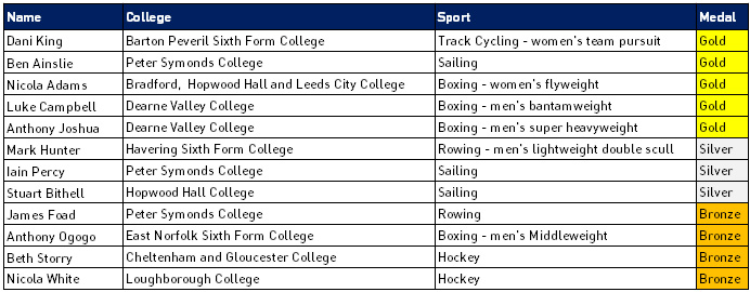 As the Olympics came to a close last night, many colleges have been celebrating the success of former and current students. Twelve of Great Britain’s 65 medals were won by college students – here is the full list of winners: Picture caption (left to right): Luke Campbell, Nicola Adams and Anthony Joshua