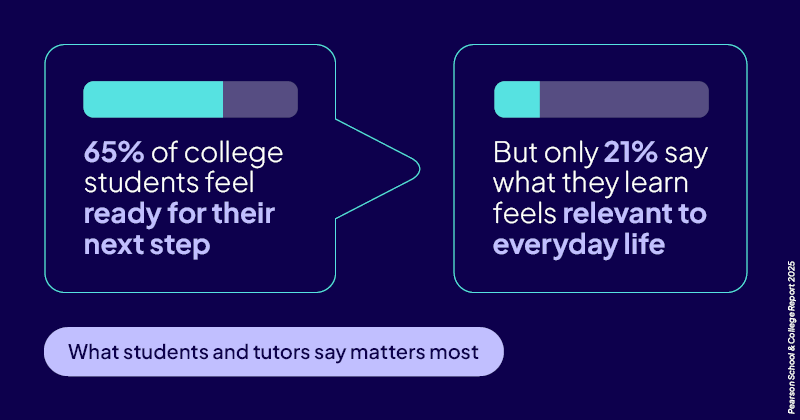 Data from Perspectives, Pearson’s first-ever college report, shows that two-thirds of students in England (65%) feel they will be ready to move on to their next steps by the end of their course, while more than half of tutors (54%) say their students are genuinely engaged in learning. The report also found a widely shared appetite for education that balances wellbeing and ambition, giving students the tools to succeed in work and life. However, just 29% of students told us they enjoy applying what they learn, while a third (33%) enjoy discovering new things.