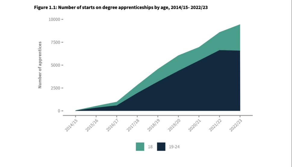 Around 2,800 young people aged 18 to 24 started a level 6 degree apprenticeship in 2017-18 compared to almost 9,500 in 2022-23.