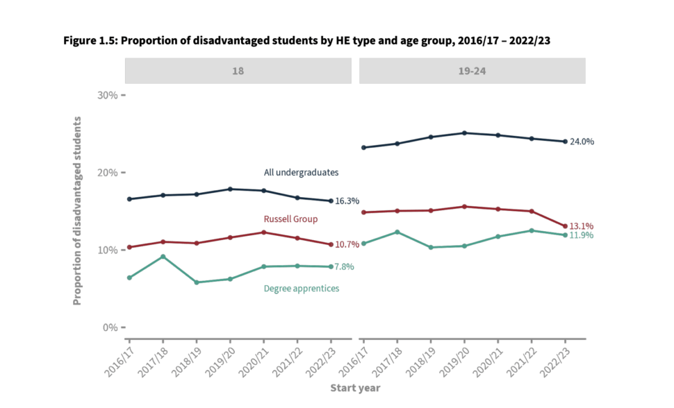 Using latest government data, EPI found that just 10.7 per cent of 18 to 24 year old level 6 degree apprentices in 2022-23 were identified as disadvantaged. That compares with 11.4 per cent of undergraduates at Russell Group universities, 19.4 per cent of all undergraduates, and 26 per cent of the wider 18-year-old cohort.