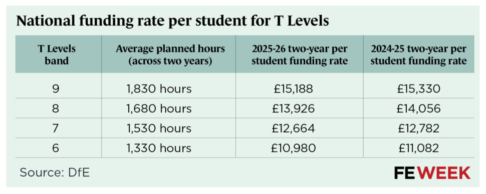 It means that the funding rate for band 9 “very large” T Levels of 1,830 total planned hours for the programme’s two years will fall from £15,330 in 2024-25 to £15,188 in 2025-26.
