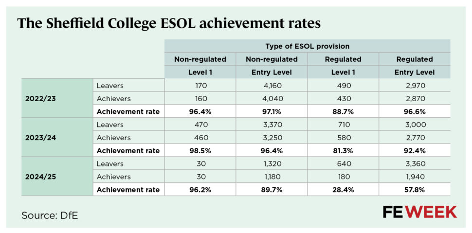 Its level 1 regulated ESOL (English for speakers of other languages) achievement rate dived from 81.3 per cent in 2023-24 to just 28.4 per cent last year.