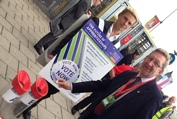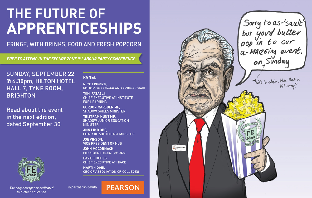 The FE Week team attended the first day of the Labour Party Conference in Brighton yesterday. We held a poll on the apprenticeship minimum wage during the day and a fringe event, sponsored by Pearson, in the evening. There will be plenty of photos and reporting in the next edition of FE Week (September 30), along with the results of the poll, but in the meantime here are a few photo highlights: The fringe event, The Future of Apprenticeships, was featured on the BBC News at 10, for being “unusual” in that the Skills Minister Matthew Hancock was beamed into the event via Skype. Screen grab from BBC News at 10 of Skills Minister Matthew Hankcock via Skype and on the panel from left Shadow Skills Minister Gordon Marsden FE Week editor Nick Linford Chair of South East Midlands LEP Ann Limb OBE and Toni Fazaeli chief executive of the Institute for Learning Len McCluskey General Secretary of the Unite union voting in the FE Week poll Stephen Twigg Shadow Education Secretary middle with Nick Linford FE Week editor far right