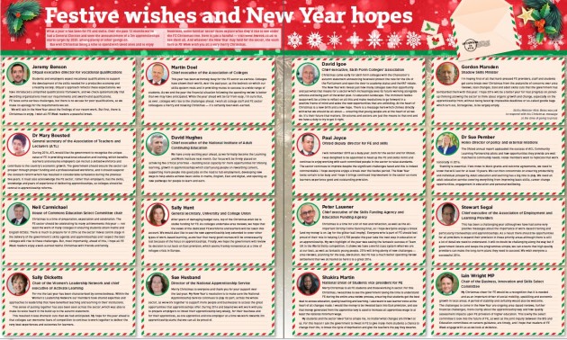 What a year it has been for FE and skills. Over the past 12 months we’ve had a General Election and seen the announcement of a 3m apprenticeships starts target by 2020, among plenty of other goings on. But with Christmas being a time to spend with loved ones and to enjoy festivities, some familiar sector faces explain what they’d like to see under the FE Christmas tree. And whatever the New Year may hold for the sector, the team here at FE Week wish you all a very merry Christmas. Jeremy Benson Ofqual executive director for vocational qualifications Students and employers expect vocational qualifications to support the development of the skills needed for a productive economy and a healthy society. Ofqual’s approach reflects these expectations: we have introduced a simplified qualifications framework, and we check systematically that awarding organisations meet our requirements and award valid qualifications. FE faces some serious challenges, but there is no excuse for poor qualifications, so we make no apology for the requirements we set. We will talk in the New Year about the findings of our recent work. But first, there is Christmas to enjoy. I wish all FE Week readers a peaceful break. Martin Doel Chief executive of the Association of Colleges This year has been extremely busy for the FE sector as a whole. Colleges have shown their worth, over the past year, as the bedrock on which our skills system rests and in providing routes to success to a wide range of students. As we end the year the financial situation following the spending review is better than we may have anticipated. While the year ahead will be far from easy, I’m sure that, as ever, colleges will rise to the challenges ahead. I wish all college staff and FE sector colleagues a merry and relaxing Christmas — it’s certainly been well-earned. Dr Mary Bousted General secretary of the Association of Teachers and Lecturers (ATL) During 2016, ATL would like the government to recognise the unique value of FE in providing vocational education and training, which benefits learners and ensures employers can recruit a skilled workforce and contribute to the country’s economic growth. The government should ensure the sector can prosper through proper funding and a professionalised workforce, and it should suspend the constant reform which has resulted in considerable turbulence during the previous five years. It must also acknowledge the FE sector, rather than employers, has the skills, knowledge and years of experience of delivering apprenticeships, so colleges should be central to apprenticeship reforms. David Hughes Chief executive of the National Institute of Adult Continuing Education We have a very exciting year ahead, as we formally become the Learning and Work Institute next month. Our focus will be firmly placed on achieving five critical priorities – building local capacity for more opportunities for lifelong learning, growth in apprenticeships which start young people on rewarding careers, supporting more people into good jobs on the road to full employment, developing new ways to help adults achieve basic skills in maths, English, Esol and digital, and opening up new pathways for people to learn and earn. Neil Carmichael House of Commons Education Select Committee chair Christmas is a time of preparation, expectation and celebration. The FE sector should be celebrating its many achievements this year — not least the work of many colleges in ensuring students attain maths and English GCSEs. There is much to prepare for in 2016 as the sector moves centre stage in the delivery of the government’s skills agenda and apprenticeships and I expect the best colleges will rise to these challenges. But, most importantly, ahead of this, I hope all FE Week readers enjoy a well-earned restful Christmas with friends and family. Sally Hunt General secretary, University and College Union After years of damaging budget cuts, top of the Christmas wish list is stable funding for FE. As colleges undertake area reviews, we hope that the views of the dedicated FE workforce and learners will be taken into account. We would also like to see the new apprenticeship levy extended to cover other types of work-based learning, as we fear that many good courses will be unnecessarily lost because of the focus on apprenticeships. Finally, we hope the government will review its decision to cut back on Esol provision, which seems frankly nonsensical at a time of refugee crisis in Europe. Sally Dicketts Chair of the Women’s Leadership Network and chief executive of Activate Learning For me the last year has been characterised by connectedness. Within the Women’s Leadership Network our members have shared expertise and approaches to leadership that have benefited teaching and learning in their institutions. This sense of pulling together has also been seen across the sector, which was able to make its voice heard in the build up to the autumn statement. This resulted in less dramatic cuts than we had anticipated. My hope for the year ahead is that colleges can overcome fears of competition to continue to work together to deliver the very best experiences and outcomes for learners. Sue Husband Director of the National Apprenticeship Service Merry Christmas to everyone and thank you for your support over the last year. My New Year’s resolution is to make sure the National Apprenticeship Service continues to play its part, across the whole sector, as we work together to support more people and businesses to access the great opportunities that apprenticeships offer. During 2016 and beyond we will work with you to prepare employers to invest their apprenticeship levy wisely, for their business and for their apprentices, as one apprentice and one employer at a time we work towards 3m apprenticeship starts that we can all be proud of. David Igoe Chief executive Sixth Form Colleges’ Association Christmas came early for sixth form colleges 