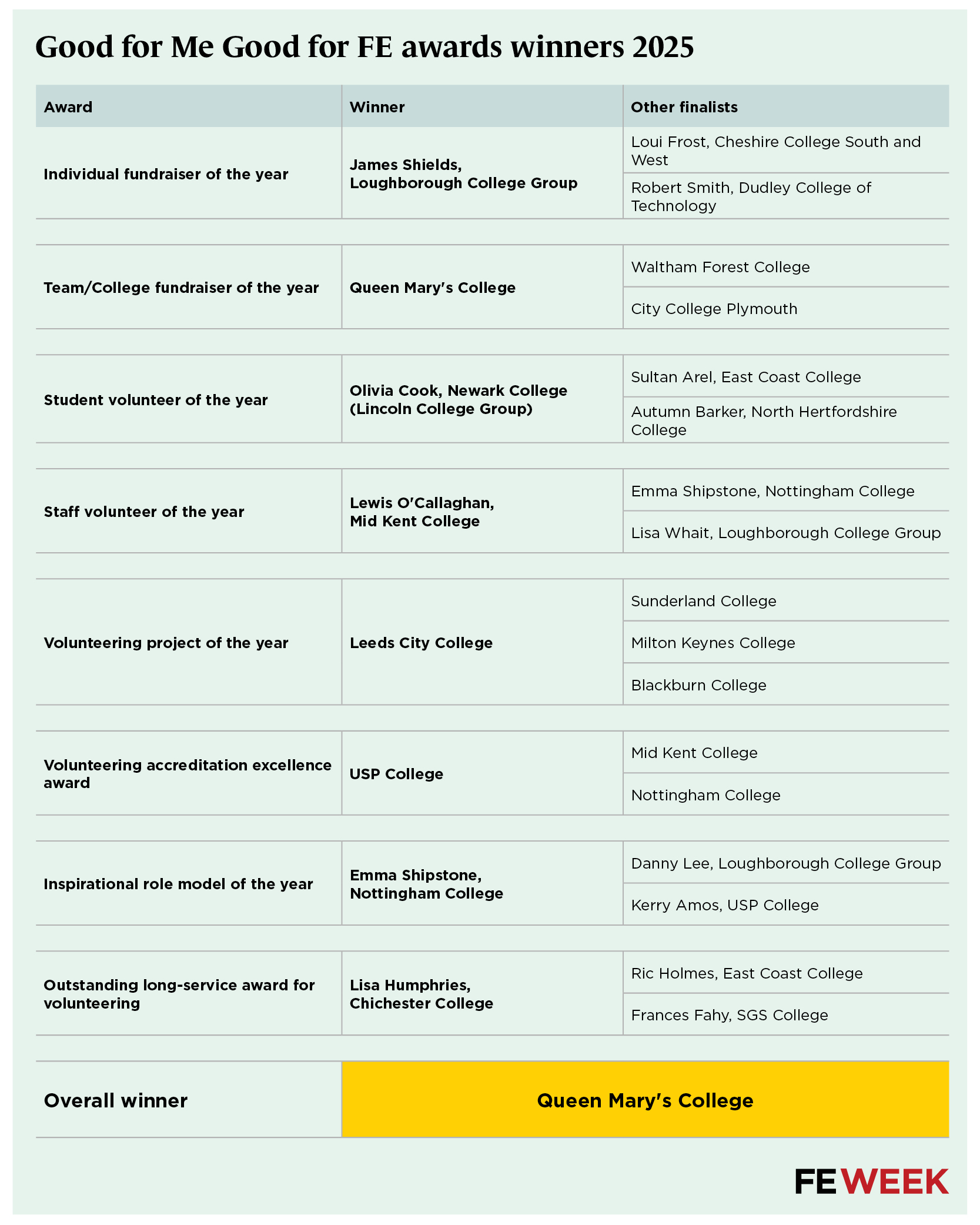 Among category winners, the individual fundraiser of the year went to accounting lecturer James Shields from Loughborough College Group, whose “amazing enthusiasm and leadership” saw him organise sponsored walks, raffles and a half-marathon to support a colleague with a rare brain tumour. His efforts raised more than £10,000 and inspired a college-wide culture of social responsibility, according to the judges.