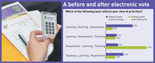 A series of questions set off the conference, with the audience asked to vote on topics such as how they would prioritise teaching, learning and assessment. You can see some of the results in the graph on page 16.