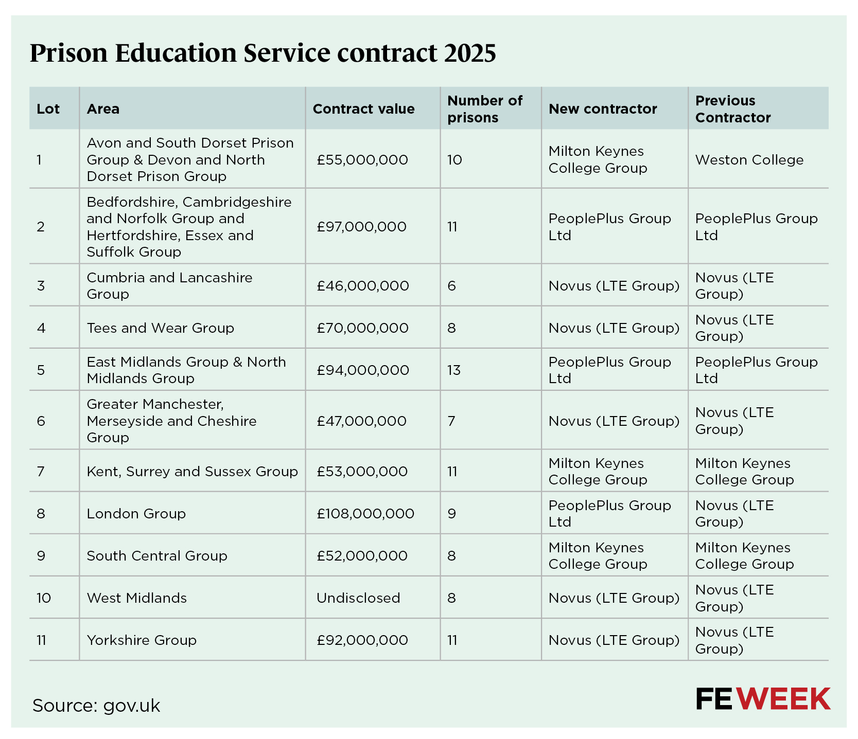 Listen to this story Members can listen to an AI-generated audio version of this article. 1.0x Audio narration uses an AI-generated voice. 0:00 0:00 Become a member to listen to this article Subscribe Eight prisons in the West Midlands have finally been appointed an education supplier after an initial failed procurement process. Existing contract-holder Novus will continue to provide core education services in the region from September 1 following the conclusion of a second tendering exercise. The Ministry of Justice re-ran the Prison Education Service (PES) contract procurement for the West Midlands lot last summer after bidders came “exceptionally close” in scoring. Novus was granted a six-month extension on the previous contract whilst the new contract was retendered. It now means Novus runs education services for 50 prisons across England, accounting for over one third of the public prison estate. Novus, which is part of Manchester-based college group LTE Group, secured four contracts worth up to £255 million in August 2025 when the winners of the PES tender were announced. The value of the West Midlands lot has not been disclosed. Peter Cox, managing director of Novus, said: “Novus has a long track record of effective collaboration with prison regimes and employers across the West Midlands, and we are delighted to continue delivering education in this region. “For more than three decades Novus has been providing high-quality education and training in the prison estate, working with learners who are the furthest from the labour market. We are proud of our track record in supporting individuals into employment after release, as well as the innovative practice led by our committed teams of education professionals. “We look forward to working closely with His Majesty’s Prison and Probation Service (HMPPS) to help more people in the West Midlands turn their lives around under PES.” New-vus? Novus is one of three suppliers for the new prison education service, which began in October. The winners of PES were supposed to be announced in early 2025, with contracts starting in April, but the MoJ delayed to “allow more time for contract award and mobilisation”. The contracts, which began in October and are worth up to £1.5 billion in total, were handed to three existing providers: Milton Keynes College, People Plus and Novus. It meant education in just 26 out of England’s 102 prisons changed hands. Jails are currently experiencing cuts to planned education hours, with prisons in Greater Manchester and Merseyside being hit the hardest since the new contract took effect six months ago. Novus manages education in seven prisons in the Greater Manchester, Merseyside and Cheshire region, which are now subject to a 40 per cent reduction in education hours. Its other contracts, in Yorkshire and Cumbria, are facing cuts of between 24 and 26 per cent. But Novus’s eight prisons in the North East have weathered the cuts, seeing just a 2 per cent reduction in education hours. According to the MoJ, the regional differences are due to a “revised” funding formula to prison budgets which is based on prison population and regional cost differences.