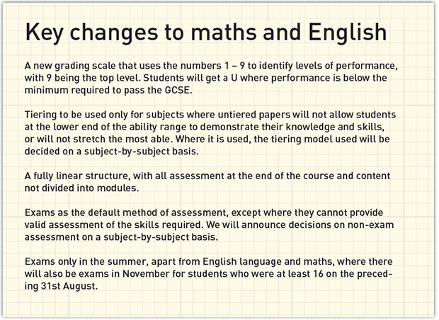 Ofqual has published full details of the new maths and English GCSEs which will be introduced from 2015. In a report published today, the qualifications watchdog confirmed there will be a new grading scale that uses the numbers 1 to 9 to identify levels of performance, with 9 being the top level. Maths, English language and English literature will all be assessed by exams, without coursework. There will be no tiering of papers for English language and literature, but higher and lower level papers will be retained for maths. Most exams will only be sat in the summer, apart from limited cases with English language and maths where students who were 16 on the preceding August 31 will be able to take them in November. Ofqual’s chief regulator Glenys Stacey explained why the grading system had been changed. She said: “For many people, the move away from traditional grades, A, B, C and so on, may be hard to understand. But it is important. The new qualifications will be significantly different and we need to signal this clearly.” In a public consultation on the new GCSEs, the Association of Colleges (AoC) raised concern about students who failed to achieve a C grade at English and maths, simply being forced to resit the same exam in FE. It said there should be pre-GCSE stepping-stone qualifications and a better link between functional skills and GCSEs — which it claimed would make it easier for post-16 students to gradually improve up to GCSE level. The AoC also disapproved of plans to scrap coursework and base the assessment entirely on end-of-course exams. It stated: “We are concerned a return to fully linear GCSEs with 100 per cent end assessment by external examination will not suit some young people. “Research shows that end assessment favours boys, while continuous assessment and coursework favours girls.” The AoC also raised concern that students with special needs could struggle to cope with high pressure exam situations. The government also confirmed on October 28 that the new maths and English GCSEs would be incorporated into apprenticeships instead of functional skills from 2017. Roger Francis, from vocational training firm Creative Learning Partners Ltd, raised concern this would rule out many less academic young people. He said: “If the new GCSEs become the only standard for future apprentices, then there is a serious danger that thousands of young people who simply cannot cope with the rigours of an academic course will be disadvantaged and unable to complete an apprenticeship.” The Association of Employment and Learning Providers also commented in its submission to the GCSE consultation. It stated: “They [the reformed maths and English GCSEs] must be flexible enough to meet the needs of learners in work-based settings, where high quality programmes such as apprenticeships and traineeships are not linked to the academic year.”