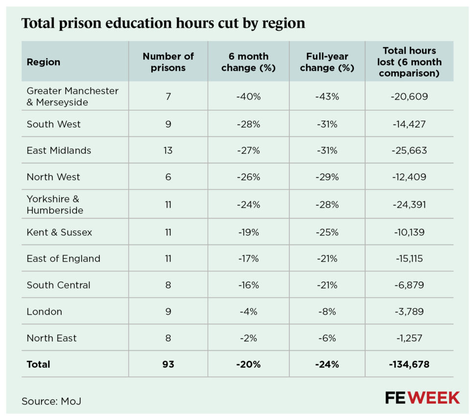 Prisons in Greater Manchester and Merseyside have experienced the largest drop. On average, the seven prisons in the region saw a 40 per cent reduction in education hours.