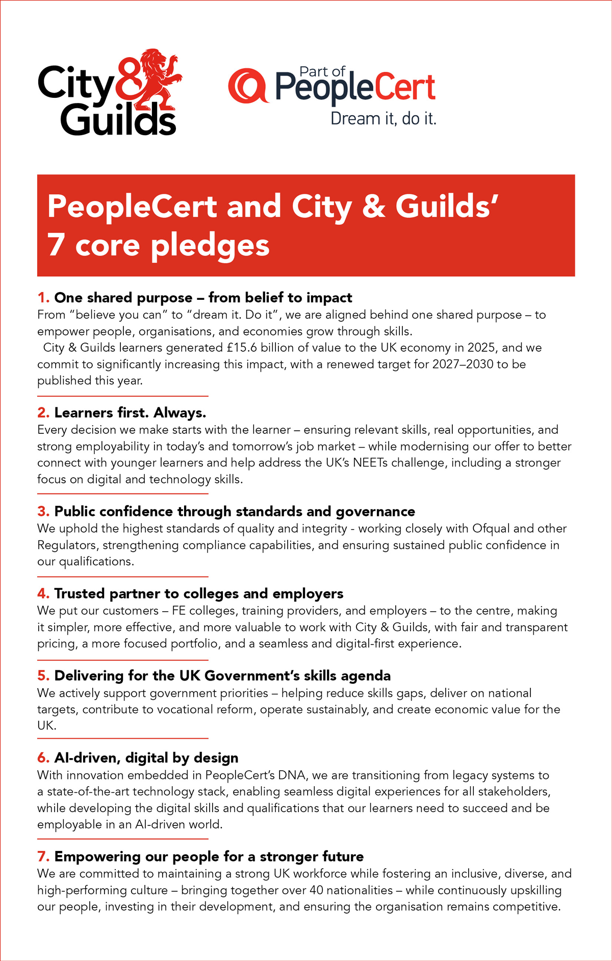 He states that the next chapter for the organisation will be steered by seven pledges (see image below) that include putting learners first, creating public confidence through the highest standards and governance, putting training provider, college and employer customers central, and delivering for the UK government’s skills agenda.