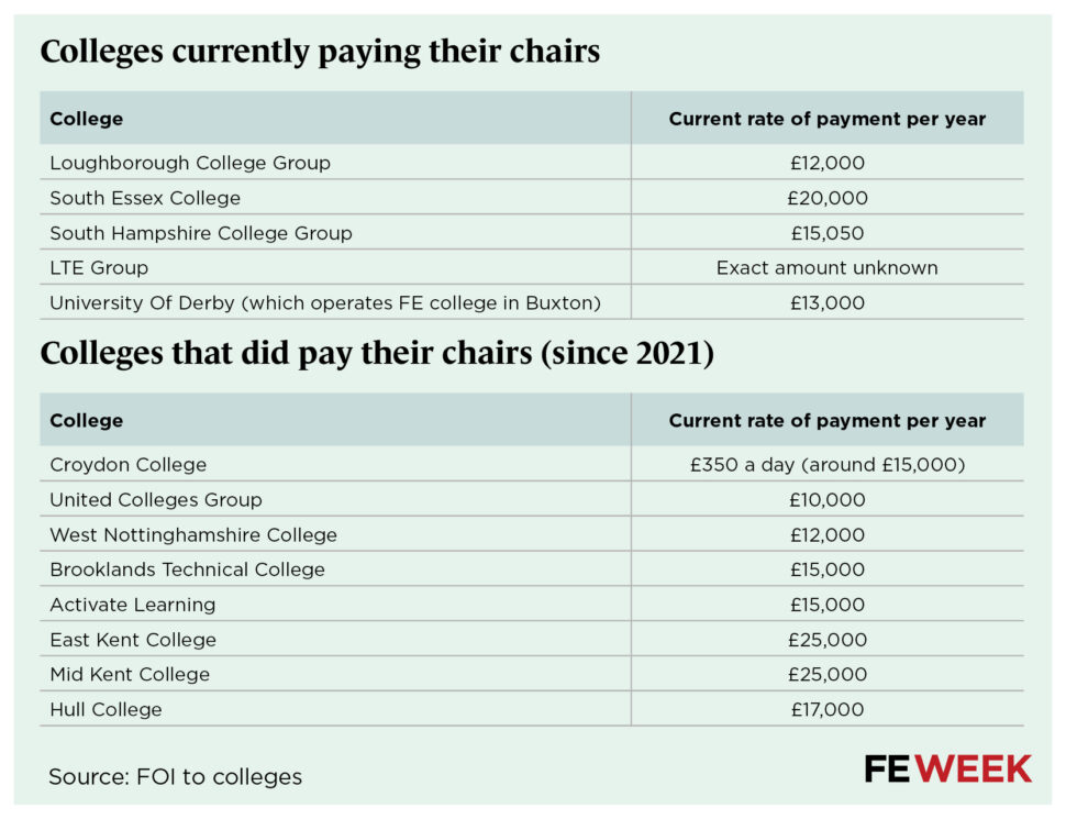 At least 14 colleges and college groups have paid their chairs since 2016, our research revealed. Of 166 colleges and college groups that responded to our freedom of information request, nine previously paid their chair (including eight since 2021) while five are currently doing so.