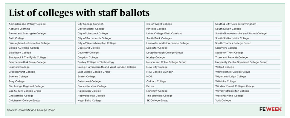 This total has decreased as active negotiations on pay and conditions are ongoing between UCU branches and college leaders, FE Week understands.