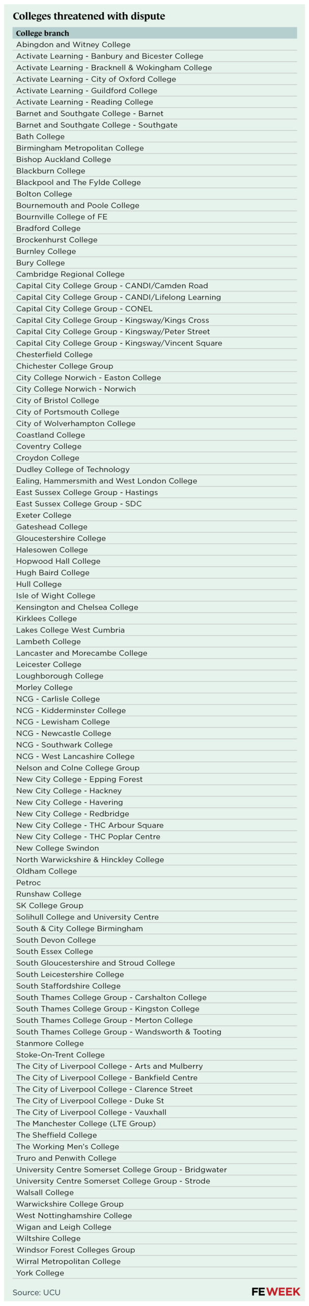 [Update 25.09.25: This article was updated to reflect 76 colleges were at risk of dispute as UCU included The Heart of Yorkshire Education Group on the list in an “internal error”.]
