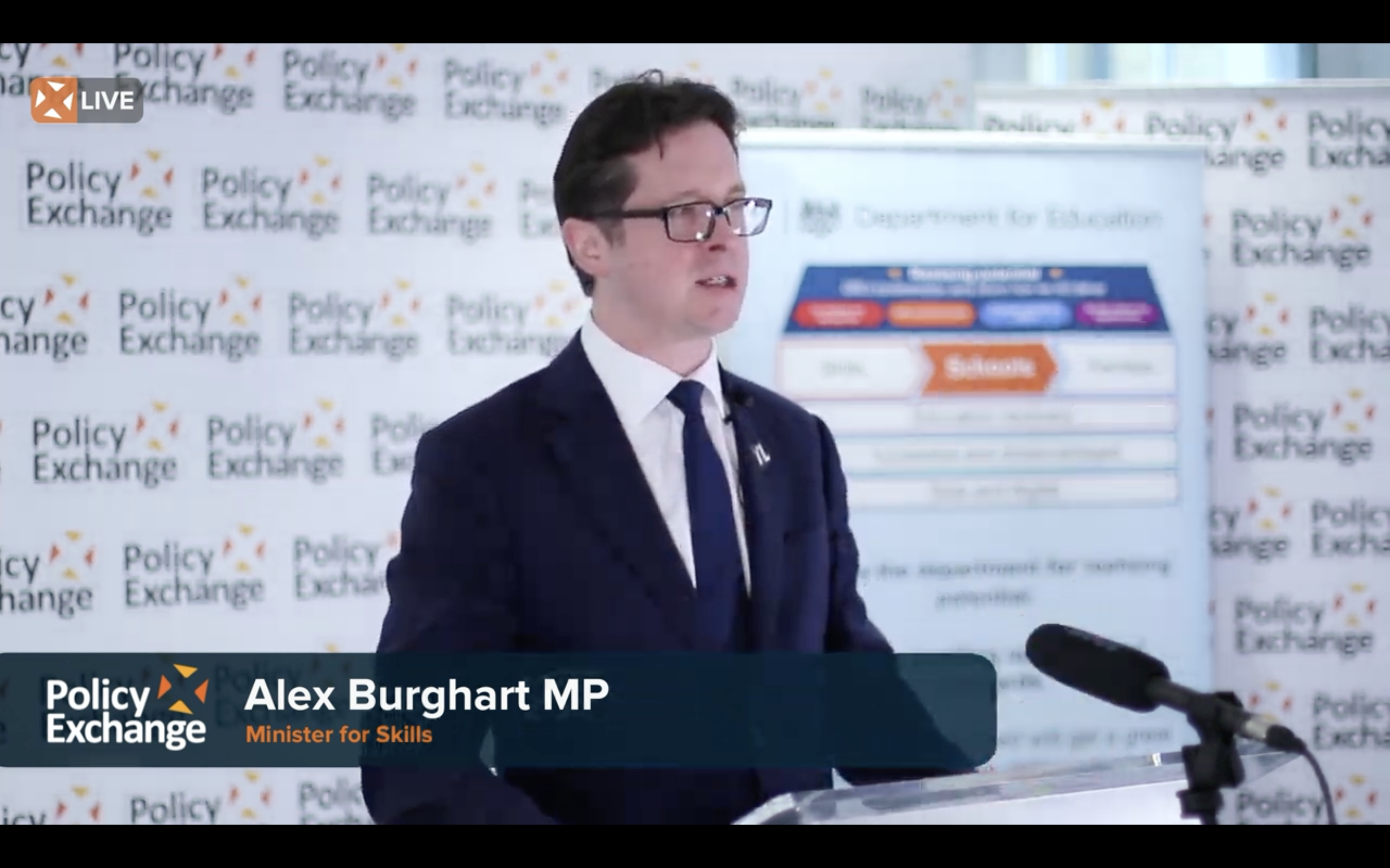 Alex Burghart, minister for skills, speaking at Policy Exchange today